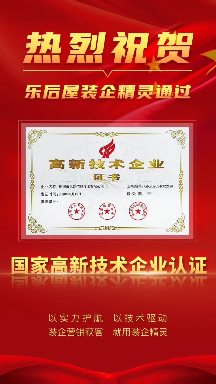 該證書由安徽省科學技術廳、安徽省財政廳、國家稅務總局安徽省稅務局頒發標志著樂后屋由此正式邁入高新技術企業行列